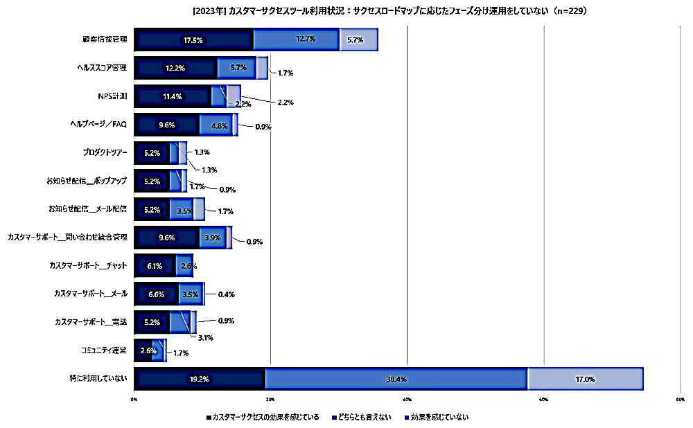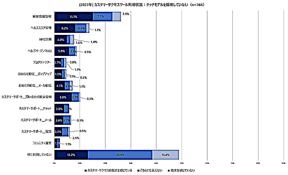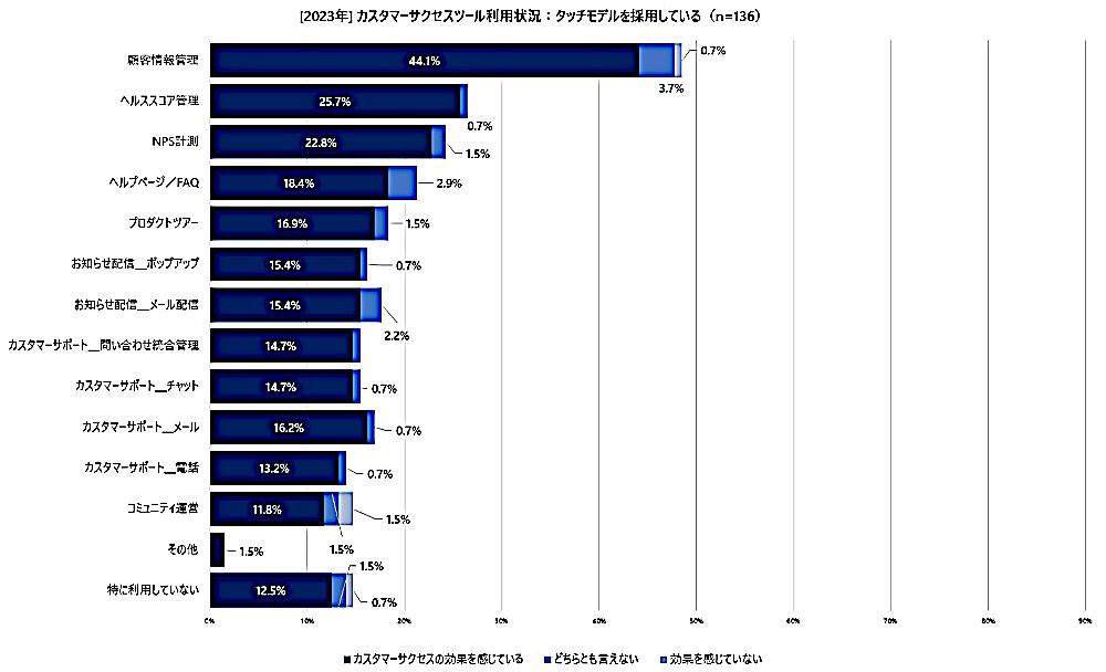 「タッチモデルを採用していない層」のカスタマーサクセスツール利用状況は、約半数がツールを利用していないことに加え、採用している層と比べて、効果を感じている人の割合が少なかった。