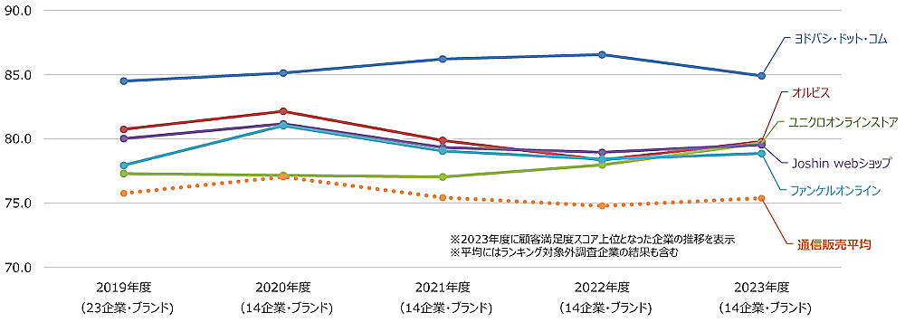 通信販売の顧客満足度スコアは、「ヨドバシ・ドット・コム」が84.9と突出。2位から5位のスコアは78から79台で、大きく引き離している。2位以下は「オルビス」「ユニクロオンラインストア」「Joshin webショップ」「ファンケルオンライン」だった。