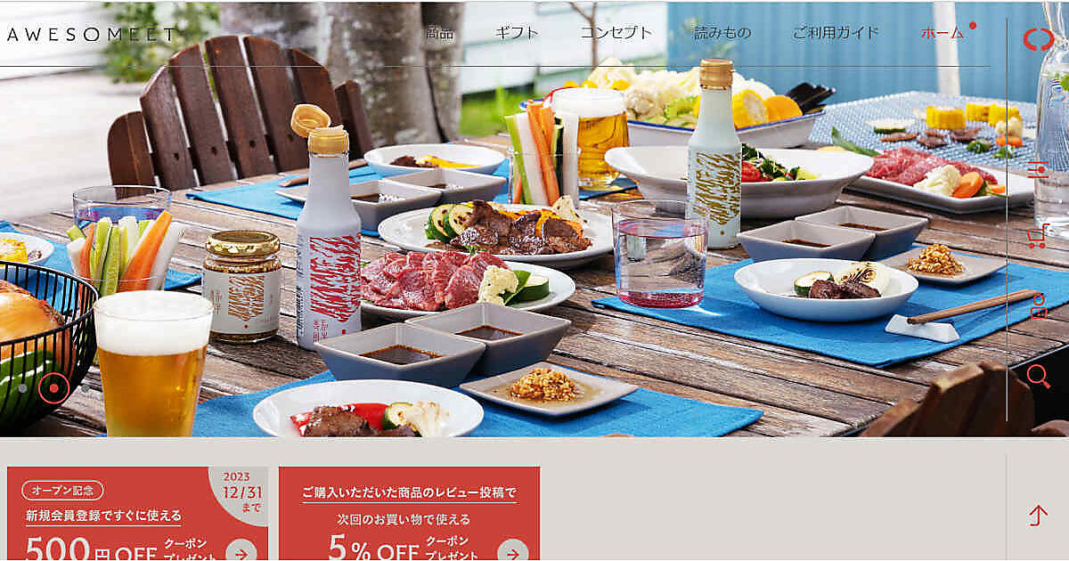 自社ECサイトの名称は「AWESOMEET(オーサミート)」で、ECプラットフォーム「Shopify」でECサイトを構築・運用している。ブランド理念は、おいしい商品、大切な人と食事する時間など、さまざまな“出会い”を生み出すこと。