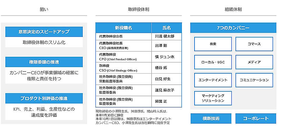 組織体制は、検索、コマース、ローカル・UGC、メディア、エンターテイメント、コミュニケーション、マーケティングソリューションという7つのカンパニー体制に移行。カンパニーCEOが事業領域の経営に権限と責任を持つ体制にする。