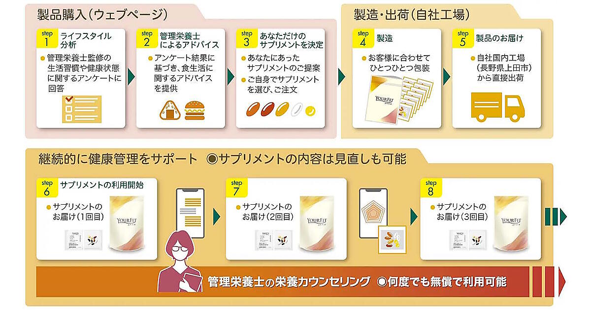 管理栄養士が監修した生活習慣や健康状態に関するアンケートに顧客が回答。アンケート結果に基づき、管理栄養士が食生活に関するアドバイスを行い、顧客に合ったサプリメントを提案する。顧客は自分でサプリメントを選び、注文できる。