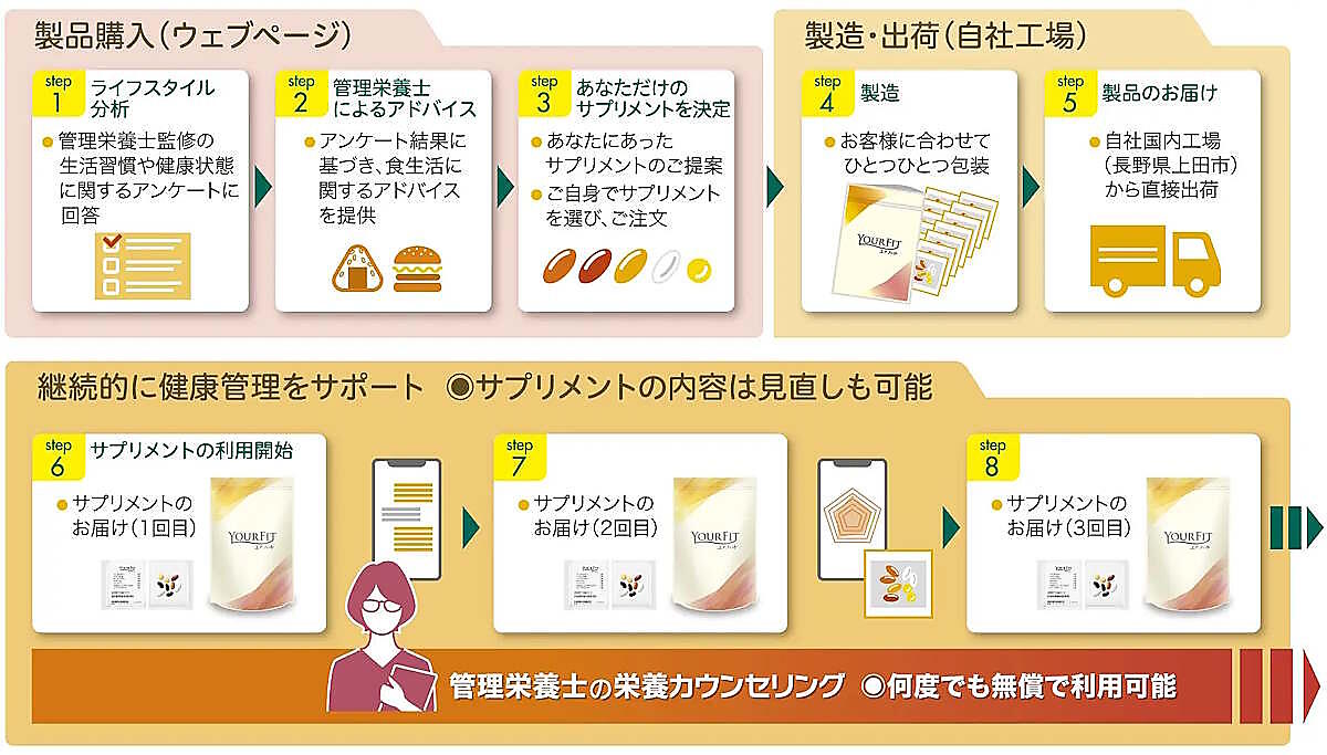 「ユアフィット」は顧客の健康状態に合ったサプリメントを提案・販売するほか、管理栄養士による栄養カウンセリングを無償で継続的に提供する。