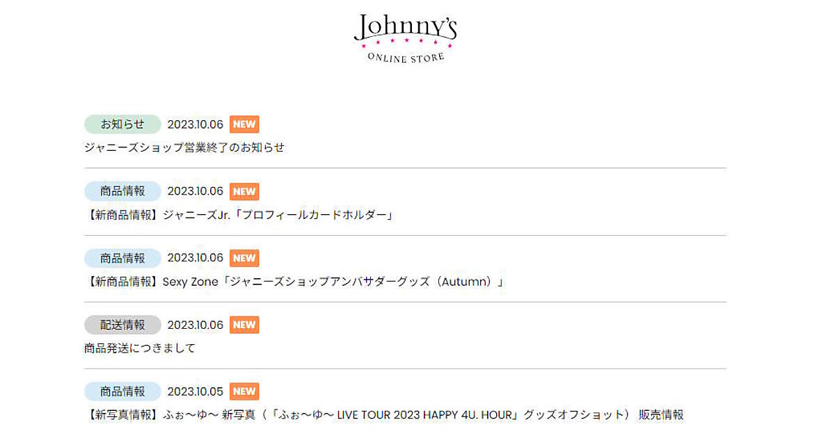 ジャニーズ事務所は、公認グッズのECサイト「ジャニーズショップ オンラインストア」の営業を終了する。10月6日、グループ企業が運営するECサイト上で明らかにした。