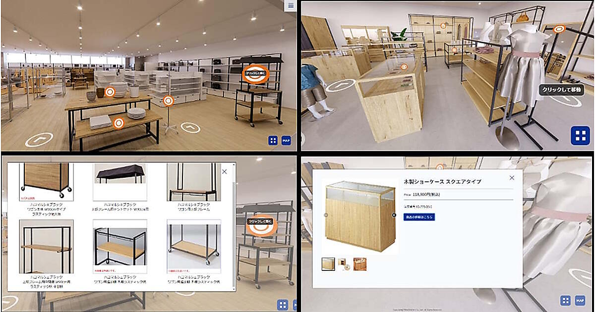 開設した「ストア・エキスプレス バーチャルショールーム」では、ショッピングモール風のバーチャル空間に、アパレル・雑貨店・量販店向けのショールームを展開している。展示しているのは3DCGで再現した什器。バーチャル店舗を訪れたユーザーが、店内での什器レイアウトや商品陳列をリアルに近い形でイメージできるようにしている。