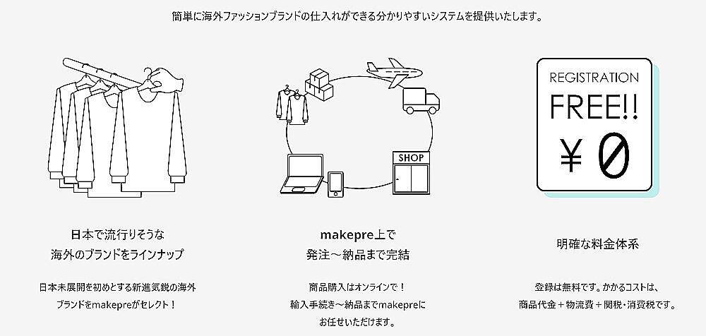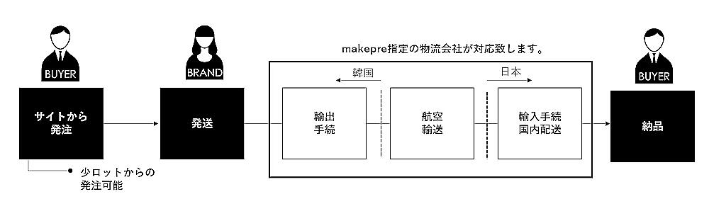 商品輸入で必要な輸入申告や税関審査などの手続きは「makepre」が代行する。バイヤーが発注した商品は、「makepre」が指定する物流事業者が発送から納品まで対応する。