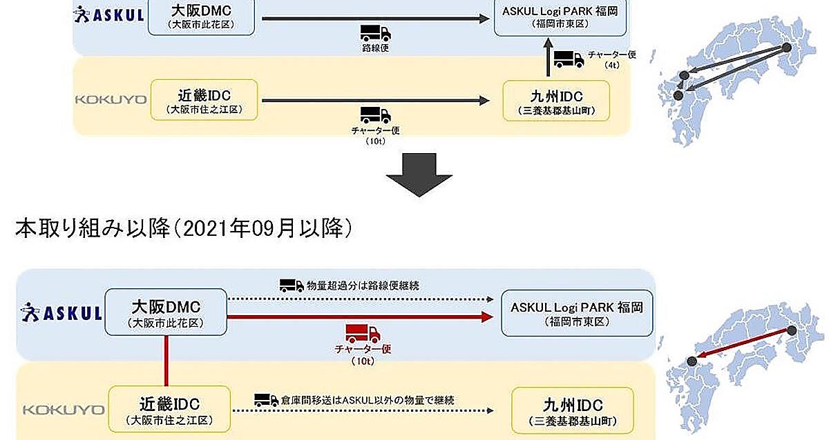 「(九州の)コクヨ側の拠点とアスクルの拠点が非常に近いこと。また、最終的に両社とも『ALP福岡』に向けて同じような輸送経路を行っているのであれば両社輸送を共同で行うことで輸送車を集約して効率化できるのではないかと考えた」(アスクル)として、2021年9月からアスクルとKSLが共同輸送の実証実験をスタート。