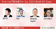 Daiの鵜飼智史 取締役COOが「ネットショップ担当者フォーラム2023夏 BtoB-EC Days」で、BtoB-ECのメリット、インボイス制度や電帳法への対応について解説した。