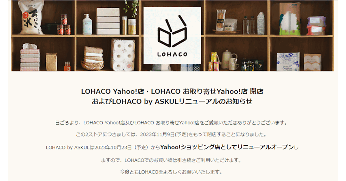 本店の「LOHACO by ASKUL」を「Yahoo!ショッピング店」として10月23日にリニューアルオープン。「LOHACO Yahoo!店」「LOHACO お取り寄せYahoo!店」は11月9日に閉店する。
