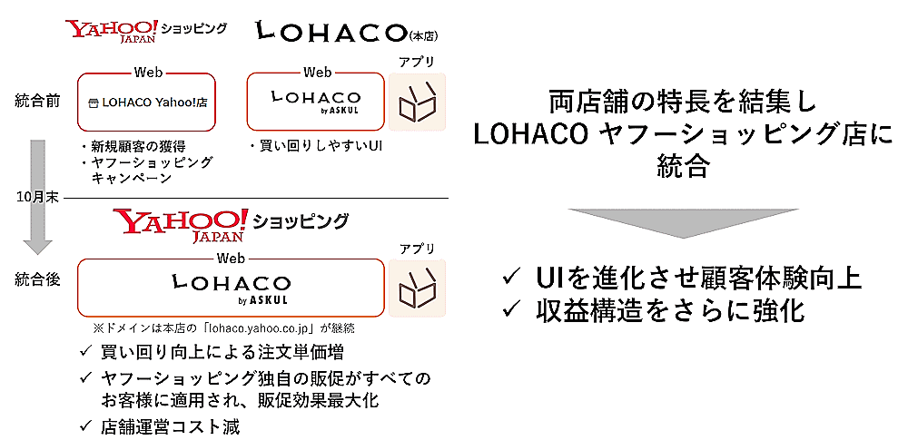 アスクルは消費者向けECサイト「LOHACO」の本店と「Yahoo!ショッピング店」を統合する。
