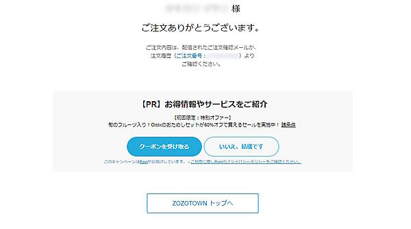 ZOZOはこのほど、ファッションECモール「ZOZOTOWN」において、商品購入完了画面で購入客に広告を配信する取り組みを始めた。
