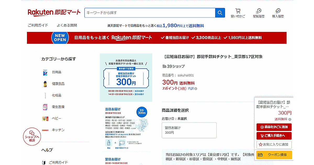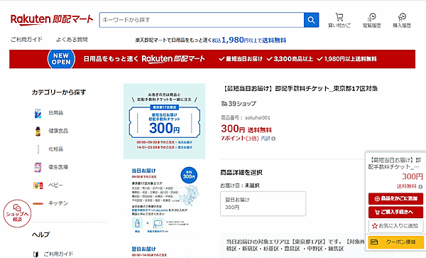 都内17区での即日配送は、手数料300円の「即配手数料チケット」を購入すると利用できる。1980円(税込)以上の購入金額の場合、送料は楽天グループが負担する。