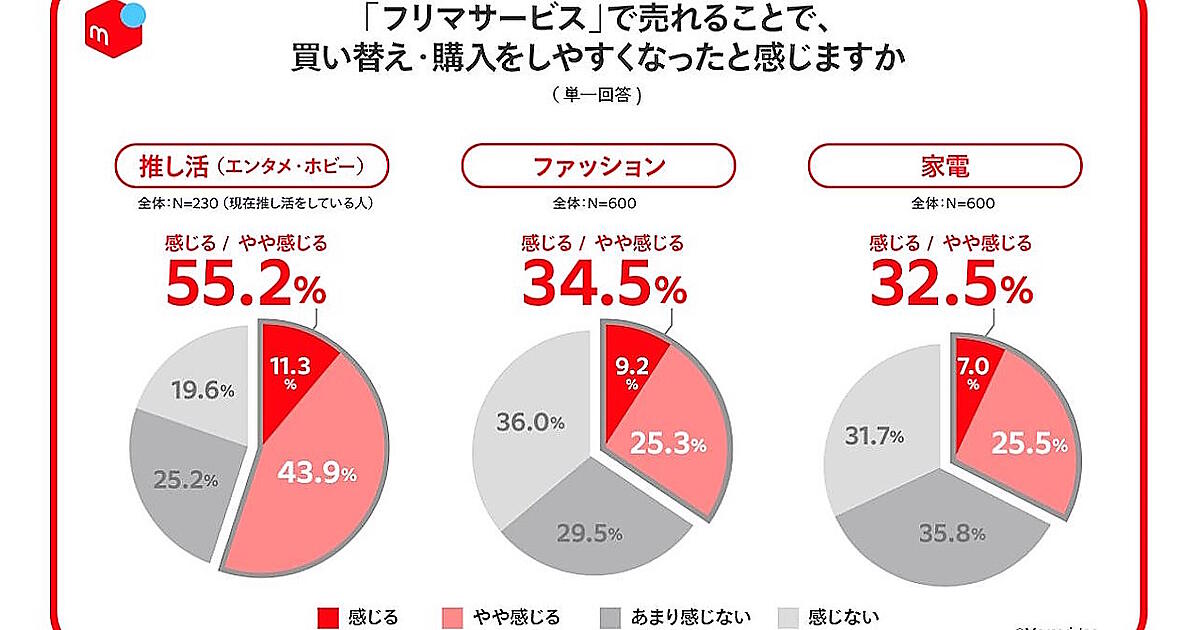 フリマサービスで売れることで、買い替え・購入をしやすくなったと感じるかを聞いたところ、「推し活」で55.2%、「ファッション」で34.5%、「家電」で32.5%だった。各カテゴリーで、フリマサービスが一定の層の買い替え・購入意欲を促進していることがわかった。