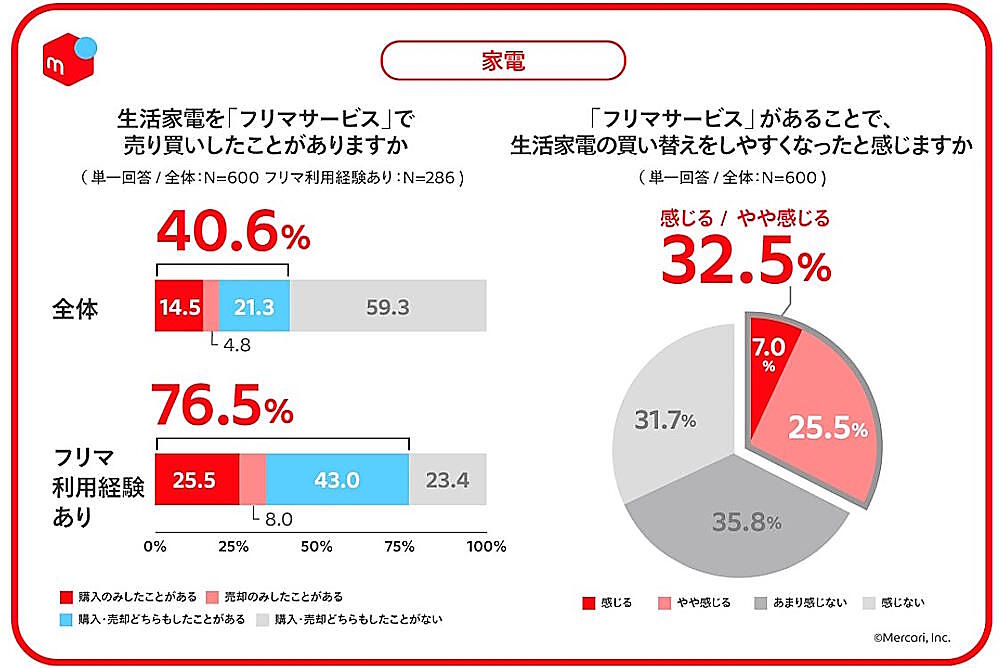 メルカリの研究組織「メルカリ総合研究所」が実施した「リユース人気カテゴリーにおける消費動向調査」(18歳~57歳の男女600人を対象に実施)によると、フリマの利用やリユース品の活用が消費者に積極的な購買行動を促していることがわかった。