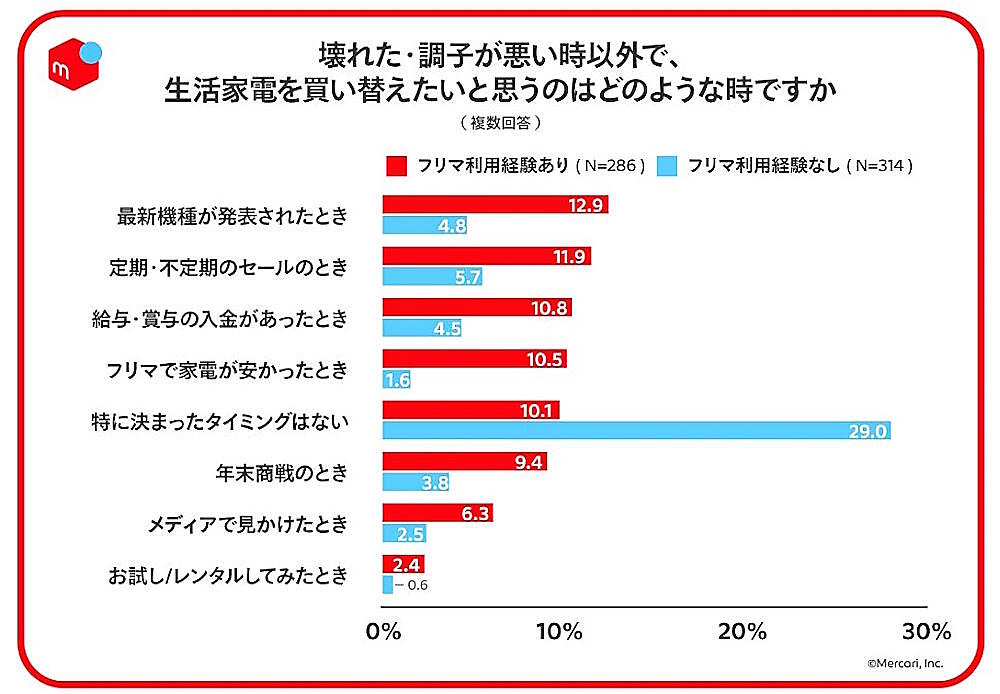 生活家電の買い替えは「壊れた・調子が悪くなった時」が多いが、「フリマサービス利用者」は壊れた時以外でも買い替えを検討する意向が高い。