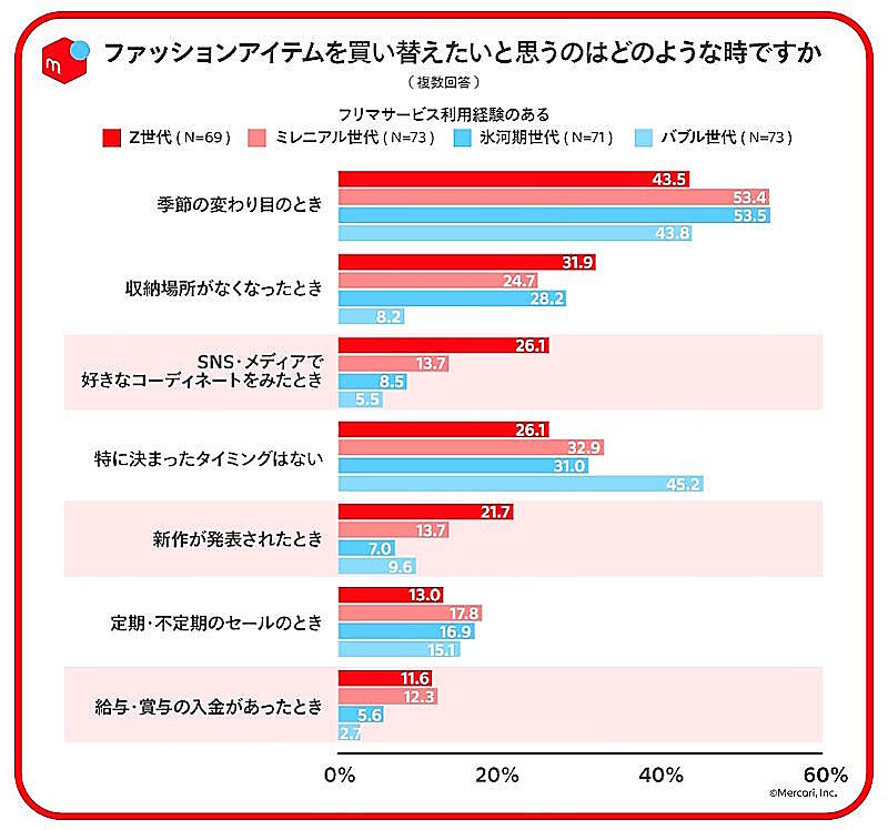 ファッションアイテムの買い替えを考えるタイミングを世代別に見てみると、Z世代はメディアで見たときや新作発表、給与や収入があった時など買いたい時に買い替えをしている傾向が見られた。Z世代を中心に、季節の変わり目など特定の時期にまとめて衣替えするのではなく、その都度必要なアイテムに入れ替えていく傾向があることがわかった。