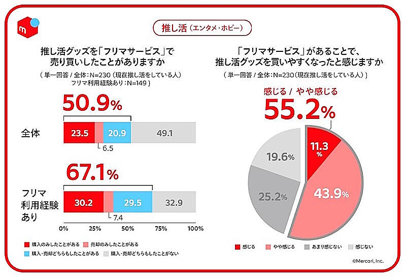 「推し活」グッズをフリマサービスで売ったことがある人の理由で最も多かったのは「譲りたい」(44.0%)だった。「推し活」では、「推し変」(自分の推しを変えること)、あるいは推し以外のグッズを他の人に譲るといったときにフリマサービスを利用。「フリマサービスで保有グッズが売れることで、他の推し活グッズを買いやすくなっている」は55.2%に達している。