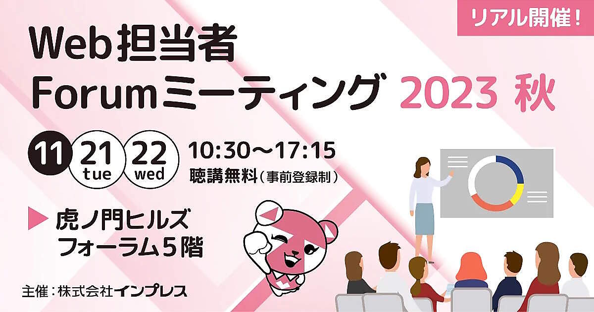 MIXI、日本マイクロソフト、タイガー魔法瓶、メルカリなどが登壇する「Web担当者Forumミーティング 2023 秋」を11月21日(火)~22日(水)の2日間、虎ノ門ヒルズフォーラムで開催します。今回は4年ぶりの完全リアル開催です!