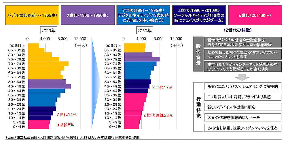EC化が加速するのは人口減少、人口動態などの影響も大きい。消費の中心を担う15~64歳は2020年の7406万人から2050年には5275万人まで減少。一方、2050年の消費の担い手は全世代でデジタルに高い親和性を持つ世代に移る。そのため、消費は一気にデジタル化が進むと見ている。