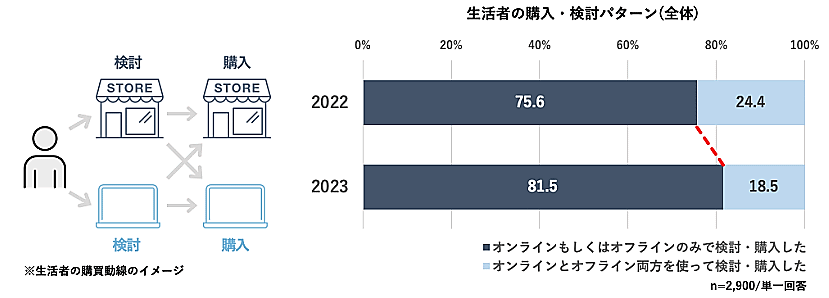 ECと店頭の使い分けが複雑化した2022年に比べ、生活者の購買行動はスマート化の傾向があるという。オンラインもしくはオフラインのみで検討・購入した比率は81.5%で、2022年比で5.9ポイント上昇した。