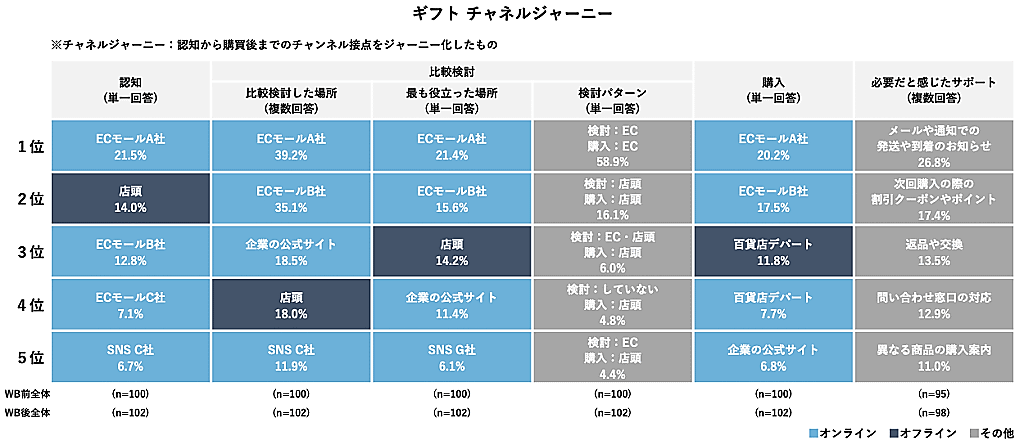 13カテゴリー・29商品の購買行動データを取得した今回の調査結果では、ギフトカテゴリーにおいては認知から購入までモール系ECの利用が店頭利用を上回った。他のカテゴリーと比較しデジタル化が進んでいることがわかった。