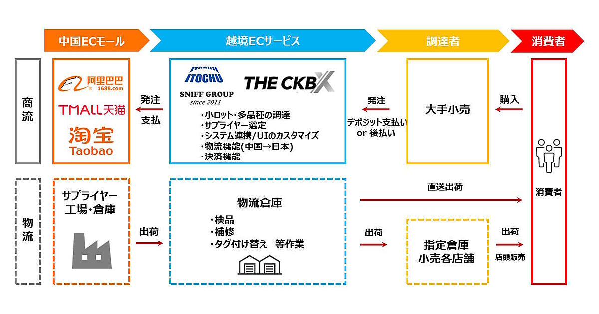 中国子会社の伊藤忠繊維貿易有限公司(ITS)とシステム開発を手がける杭州史尼芙科技有限公司(SNIFF)の合弁会社「浙江伊藤尼扶供応鏈有限公司(ITONIFF)」を設立。ITONIFFが11月からBtoB越境ECサービス「THE CKB X」を提供する。