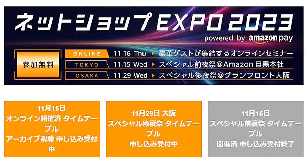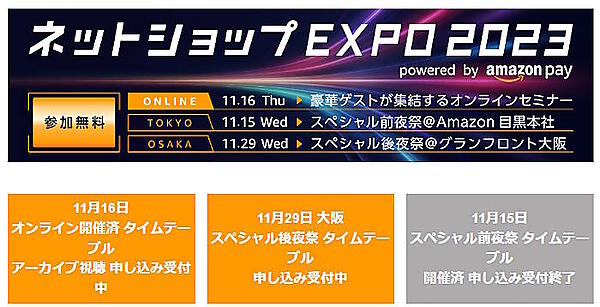 AmazonのID決済サービス「Amazon Pay」が主催するECイベント「ネットショップEXPO 2023」では現在、11月16日に配信したオンラインセミナーのアーカイブ視聴の申し込みを受け付けしている。