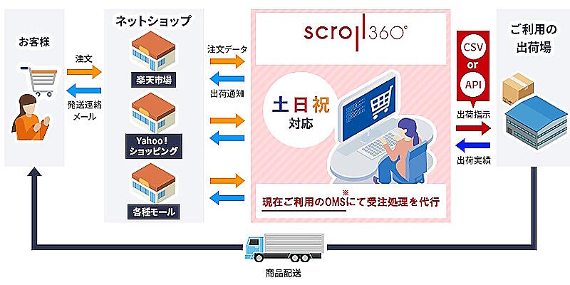 スクロール360では10月、制度への対応を検討するEC企業を対象に、受注処理代行サービスにおいて、土日祝日限定の業務委託ができる「土日祝対応プラン」を開始。ただ、出荷業務に関してはRSLなど、365日出荷が可能な物流センターを探す必要がある。