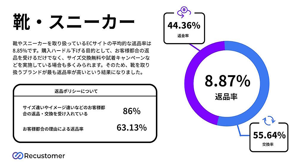 Recustomer辻󠄀野氏(以下、辻󠄀野氏):日本国内の返品率は、小売全体で3%ほど。アパレルだけで見ると約6%で、そのうち、比較的返品率が高い傾向にある靴カテゴリでも約8%にとどまっている。海外と比べると圧倒的に低い。事業者側は、まずは事業成長、つまりは売上アップに重きを置いているという側面もある。返品スキームの効率化やバックオフィスの整備は二の次になっているのが現状だ。事業全体が伸びてくればバックオフィス分野のリソースも自然と増えてくるので、返品やリバースロジスティクスに力を入れるフェーズにも進むと思う。