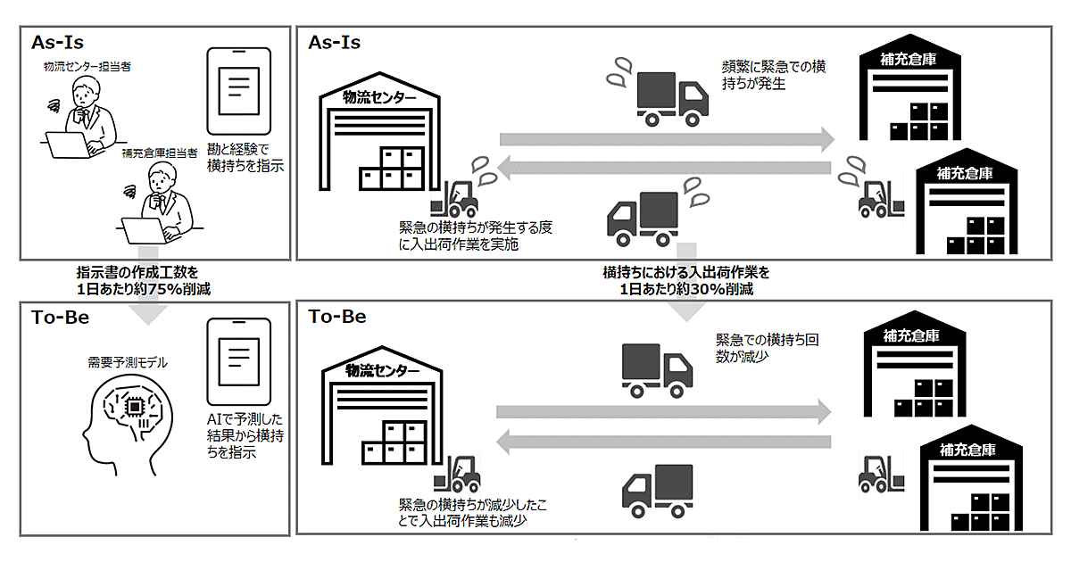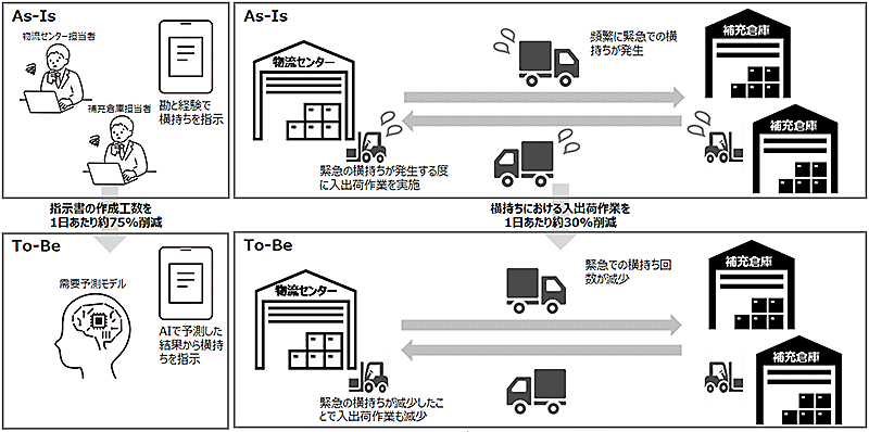 従来は、物流センターや補充倉庫の担当者が経験や知見を生かして手作業で計画を立てていた。AI需要予測モデルを活用することにより、AIで予測した結果に基づいた商品横持ち指示が可能となり、需要予測精度が向上、作業工数の削減につながっているという。