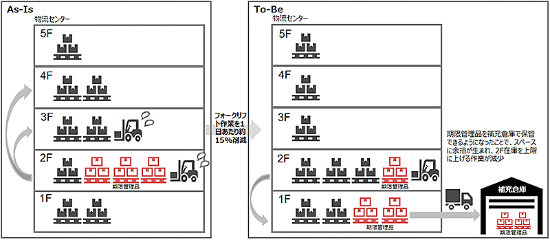また、需要予測の精度向上とシステム化で、これまでは管理が難しかったセンター内で保管していた賞味期限や使用期限がある商品を補充倉庫で保管できるようになり、センター内での商品移動削減につながった。