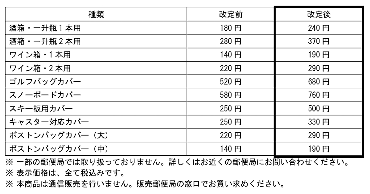 日本郵便は2024年2月1日、ゆうパック包装資材10品目の料金を改定する。値上げ幅は50円~250円。たとえば、スキー板用カバーは現状の250円から500円に引き上げる。