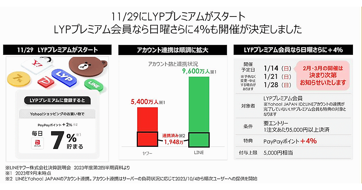 新たに始めるのは「LYPプレミアム会員なら日曜さらに+4%」。有料会員サービス「LYPプレミアム」ユーザーであれば、5000円以上の買い物で「PayPayポイント」4%を上乗せして付与する。付与上限は5000円相当。「Yahoo! JAPAN ID」とLINEアカウントの連携が完了していない「LYPプレミアム」会員も特典の対象とする。