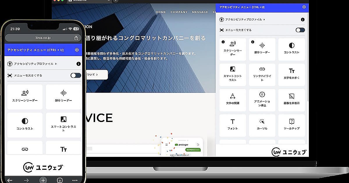 「ユニウェブ」はWebサイトにコードを追加することで、事業者は導入当日にウェブアクセシビリティに対応できるようになるサービス。