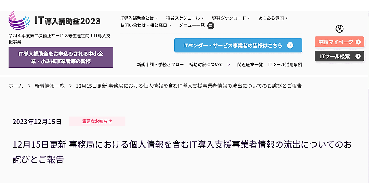 「サービス等生産性向上IT導入支援事業費補助金」(IT導入補助金2023後期事務局)のホームページ(HP)が不正アクセスを受け、個人情報を含むIT導入支援事業者情報とITツール情報が第三者に閲覧・取得されたことがわかった。流出した恐れのある個人情報数は3万8269人分。