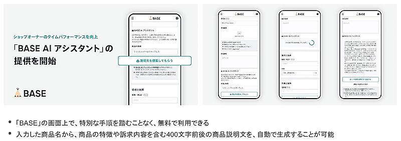 2023年4月に「ChatGPT」を活用し、ショップオーナーの作業負担を軽減・クリエイティブタイムを創出することを目的とした、「BASE AI アシスタント」をリリース。のち2023年12月6日のアップデートでは、「ショップデザインの提案」などの機能を新たに追加した。