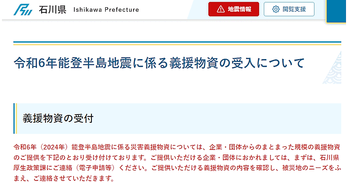 能登地方を震源とする能登半島地震で石川県は、企業・団体からのまとまった規模の義援物資の提供を受け付けている。
