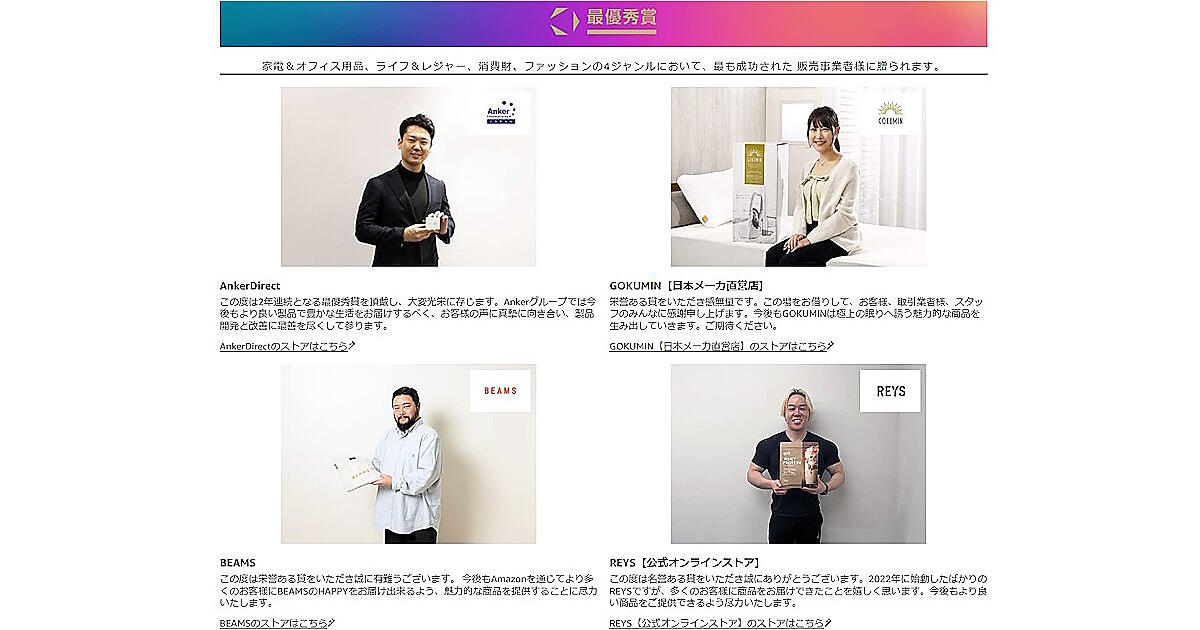 「最優秀賞」には、前年も同賞を受賞した「AnkerDirect(アンカーダイレクト)」「BEAMS」のほか、マットレス・枕販売の「GOKUMIN(ゴクミン)日本メーカ直営店」、プロテイン販売の「REYS(レイズ)【公式オンラインストア】」を選んだ。