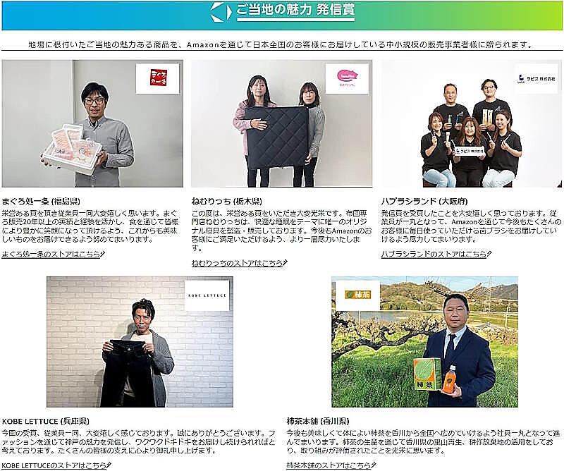 地場に根付いたご当地の魅力ある商品を、Amazonを通じて日本全国の顧客に届けている中小規模の販売事業者に贈る賞。受賞店は次の通り。