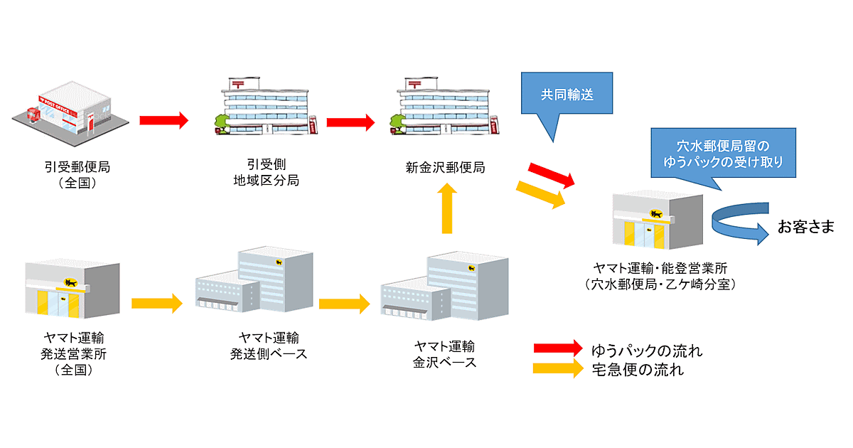 ヤマト運輸が金沢ベースから新金沢郵便局に立ち寄り、穴水郵便局留の「ゆうパック」を引き取るというオペレーションで共同輸送を実現するという。
