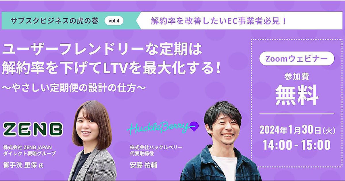 ハックルベリーは1月30日(火)、EC通販事業者向けに「ユーザーフレンドリーな定期は解約率を下げてLTVを最大化する! ~やさしい定期便の設計の仕方~」をオンラインで配信する。