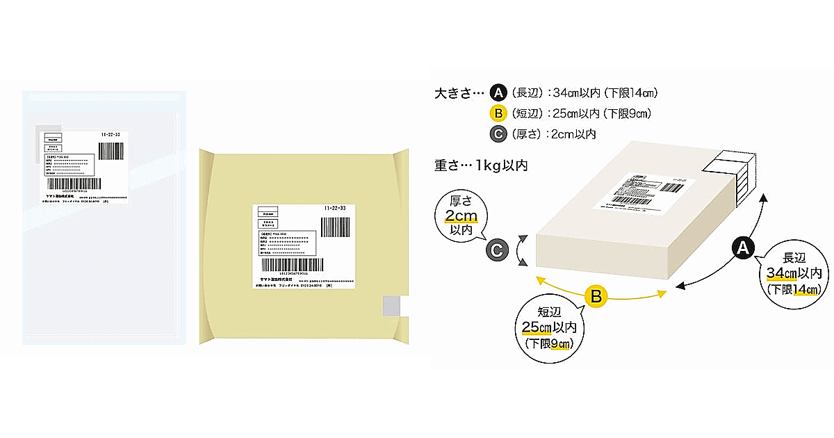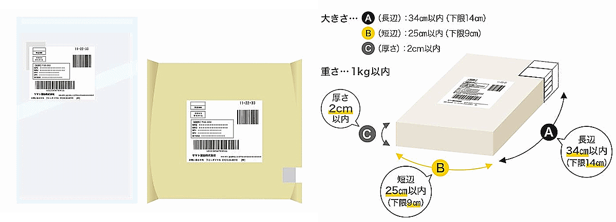 「クロネコゆうメール」の料金は、「1cm」「2cm」の厚みに応じた全国一律料金で、数量などの諸条件に応じて契約先ごとに設定する。サイズの上限は長辺34cm以内、短辺25cm以内、下限は長辺14cm以上、短辺9cm以上、厚さは2cm以内で、重さは1kg以内。365日年中無休で集荷に対応する。