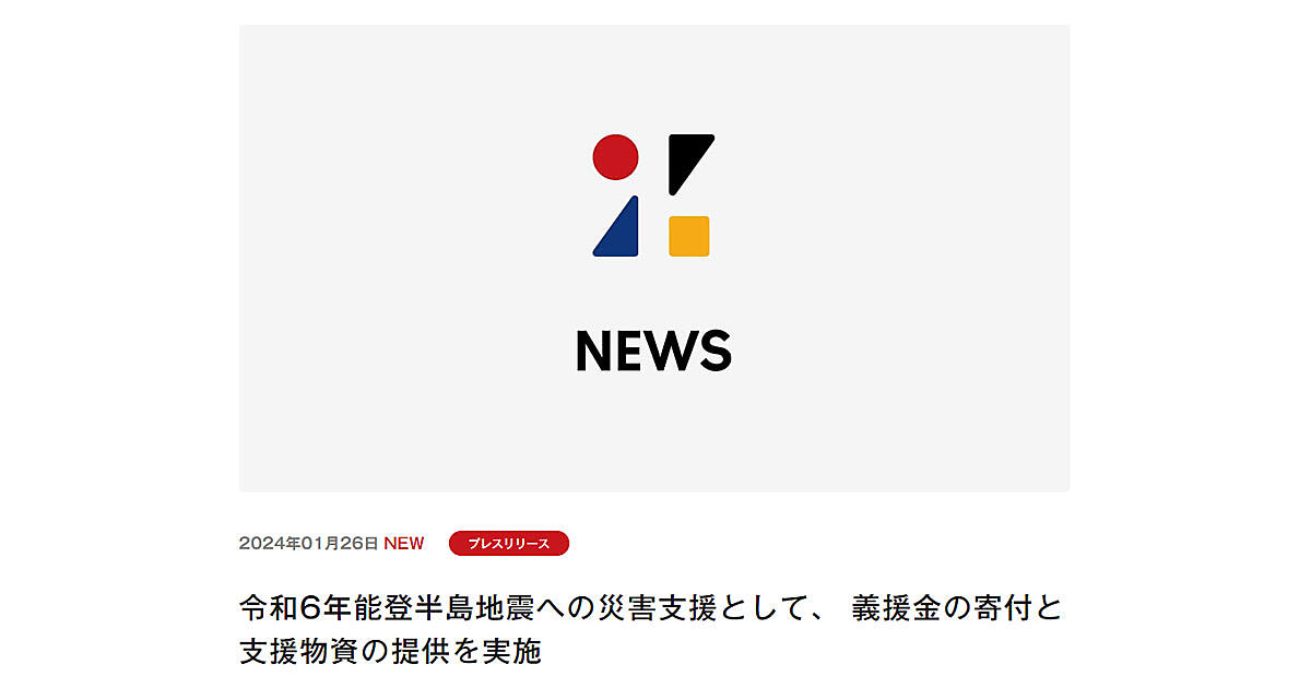 1月26日に「石川県令和6年能登半島地震災害義援金」へ500万円を寄付。義援金は、石川県災害義援金配分委員会が配分基準などを決定した後、市町を通じて被災した人たちに届けられる予定だ。