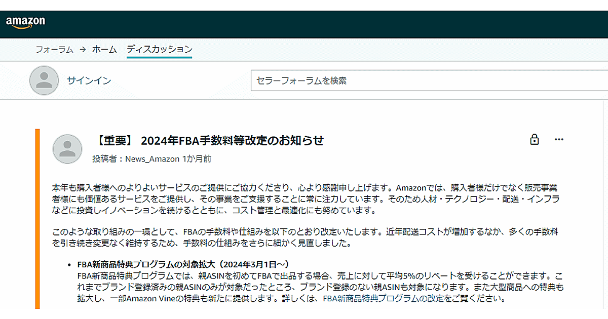 複数のバリーエーションを持つ商品グループを表す親ASIN(商品識別のためのAmazonの独自コード)を初めてFBAに出品する場合、売り上げに対して5%のリベートを受けることができる仕組みを提供している。これまで、ブランド登録済みの親ASINが対象だったが、ブランド登録のない親ASINも対象にする。