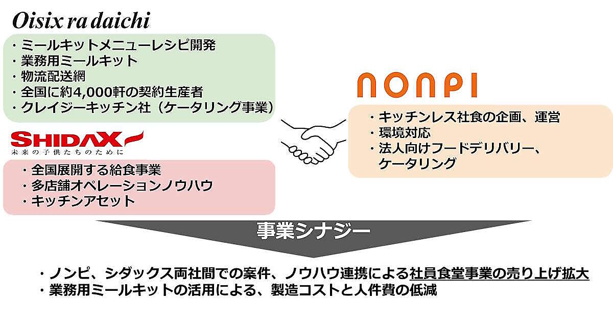 ノンピはキッチンレスの社員食堂事業、法人向けのフードデリバリー、ケータリングサービス事業を展開している。オイシックス・ラ・大地はノンピを子会社化することで、自社のBtoBサブスクリプション事業の拡大に向けてグループ間の連携を強化。食材の調達や配送の効率化、ミールキットメニューの社食提供、業務用ミールキットの作業効率などを見込む。