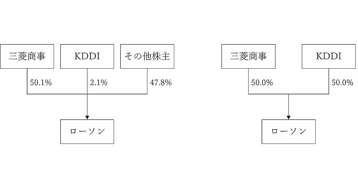 ローソンの株式を三菱商事、KDDIで50%ずつ保有し、共同経営体制を敷くことで合意した。KDDIはローソンに対する公開買付け(TOB)を実施し、現在の三菱商事51%、KDDIで50%ずつ21.%、その他株主47.8%の株主構成から、三菱商事とKDDIが50%ずつ株式を保有する体制へ移行する。TOBの実施は4月頃の予定。