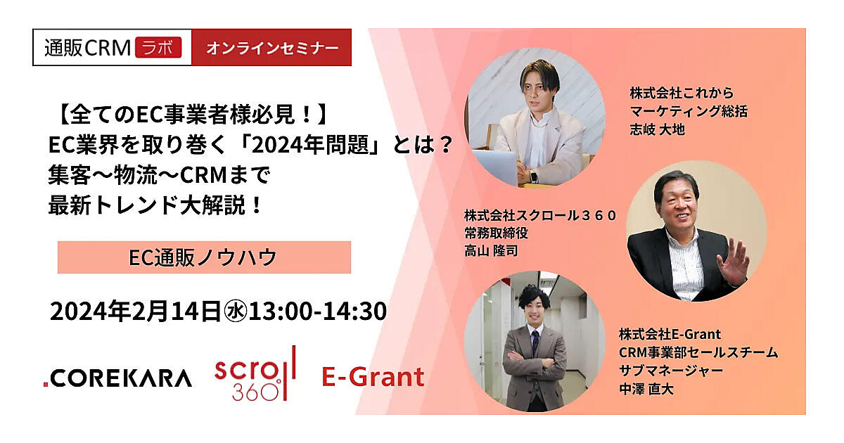 E-Grantは、スクロール360、これからと2/14(水)に、「集客、物流、CRM」をテーマにした合同オンラインセミナーを開催する。