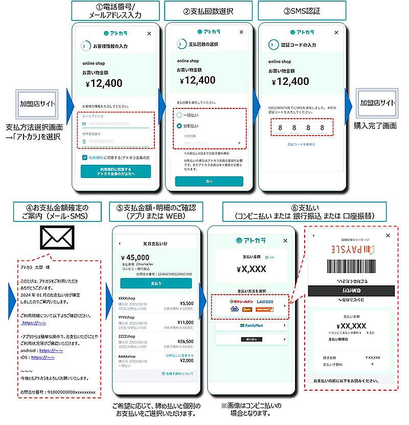 「アトカラ」は、ユーザーが商品を受取後、コンビニや銀行で代金を支払う後払い決済サービス。ECサイトやアプリでの購入時、携帯電話番号とメールアドレスのみ利用して決済できるため、クレジットカード情報の入力は不要。