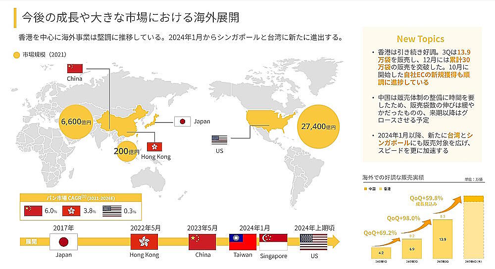 ベースフードは越境ECをシンガポール、台湾、香港および中国で展開。2022年5月から香港、2023年5月からは中国で「BASE BREAD」を販売している。2024年1月中旬からは、新たに台湾とシンガポールに商圏を広げている。
