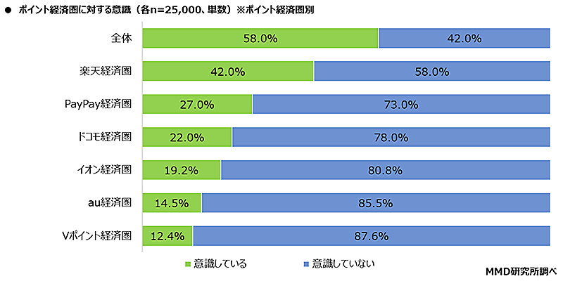 経済圏を意識しているか聞いたところ、58.0%が「意識している」と回答した。ポイント経済圏別で見ると、意識している割合が多いのは「楽天経済圏」が42.0%で最も高く、「PayPay経済圏」が27.0%、「ドコモ経済圏」が22.0%で続いた。
