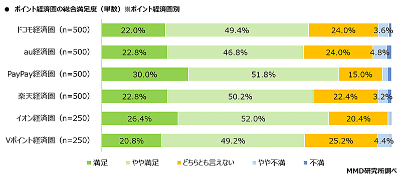メインで利用している経済圏の総合満足度を聞いたところ、「満足」と「やや満足」を合わせた満足している割合は、トップは「PayPay経済圏」(81.8%)、次いで「イオン経済圏」(78.4%)「楽天経済圏」(73.0%)だった。